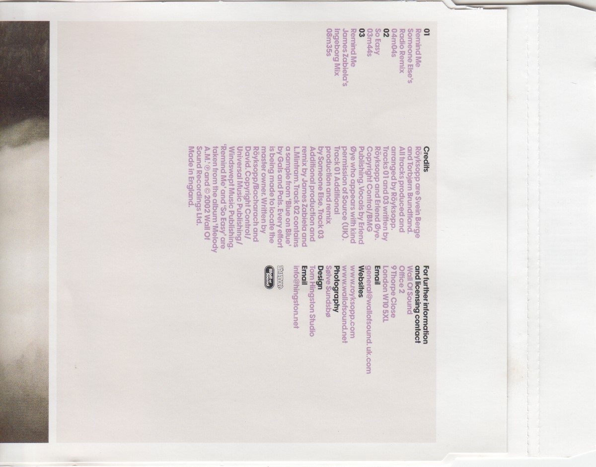 Country of release: UK Release Year: 2022 Edition: – Features: – Notes: – Tracklist: 1 Remind Me (Someone Else's Radio Remix) 4:04 2 So Easy 3:44 3 Remind Me (James Zabiela's Ingeborg Mix) 8:35 More pictures, click to view full size: