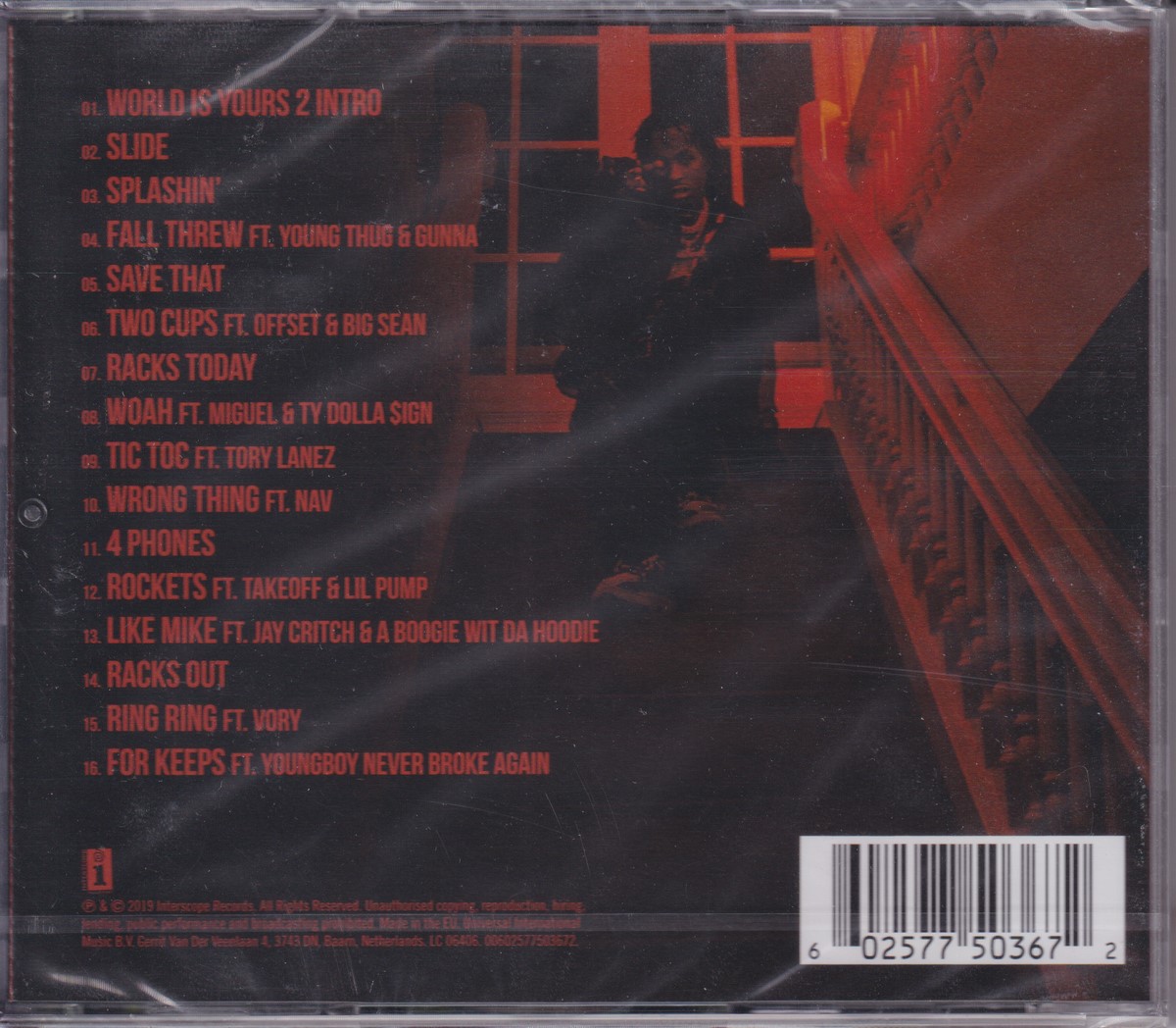Country of release: Europe Release Year: 2019 Edition: Parental Advisory Features: – Notes: – Tracklist: 1 World Is Yours 2 Intro 2:12 2 Slide 2:48 3 Splashin' 2:57 4 Fall Threw 3:09 5 Save That 2:30 6 Two Cups 3:01 7 Racks Today 2:35 8 Woah 2:52 9 Tic Toc 2:30 10 Wrong Thing 2:30 11 4 Phones 3:37 12 Rockets 3:02 13 Like Mike 2:41 14 Racks Out 2:35 15 Ring Ring 2:47 16 For Keeps 2:56 More pictures, click to view full size:
