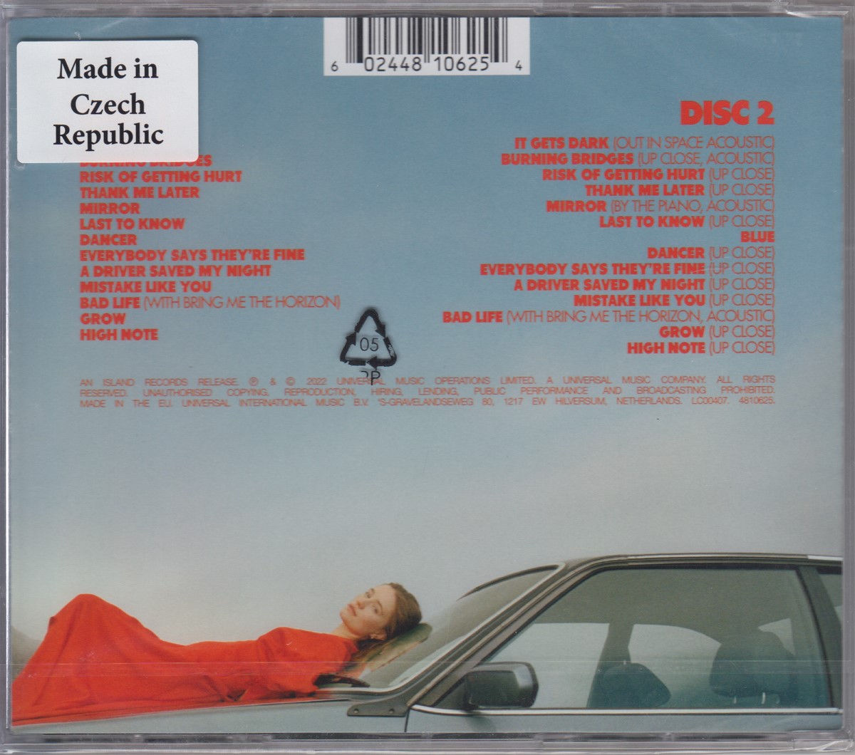 Country of release: Europe Release Year: 2022 Edition: Deluxe Edition Features: – Notes: – Tracklist: Disc 1/2: 1-1 It Gets Dark 1-2 Burning Bridges 1-3 Risk Of Getting Hurt 1-4 Thank Me Later 1-5 Mirror 1-6 Last To Know 1-7 Dancer 1-8 Everybody Says They're Fine 1-9 A Driver Saved My Night 1-10 Mistake Like You 1-11 Bad Life 1-12 Grow 1-13 High Note Disc 2/2: 2-1 It Gets Dark (Out In Space Acoustic) 2-2 Burning Bridges (Up Close, Acoustic) 2-3 Risk Of Getting Hurt (Up Close) 2-4 Thank Me Later (Up Close) 2-5 Mirror (By The Piano, Acoustic) 2-6 Last To Know (Up Close) 2-7 Blue 2-8 Dancer (Up Close) 2-9 Everybody Says They're Fine (Up Close) 2-10 A Driver Saved My Night (Up Close) 2-11 Mistake Like You (Up Close) 2-12 Bad Life (Acoustic) 2-13 Grow (Up Close) 2-14 High Note (Up Close) More pictures, click to view full size: