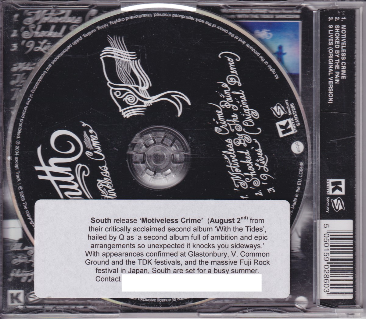 1: Media condition: Near Mint (NM or M-) Sleeve condition: Near Mint (NM or M-) Condition Notes: – eBay listing: South - Motiveless Crime (2004) NM Condition: Very Good Price: £1.95 https://www.ebay.co.uk/itm/116795040557