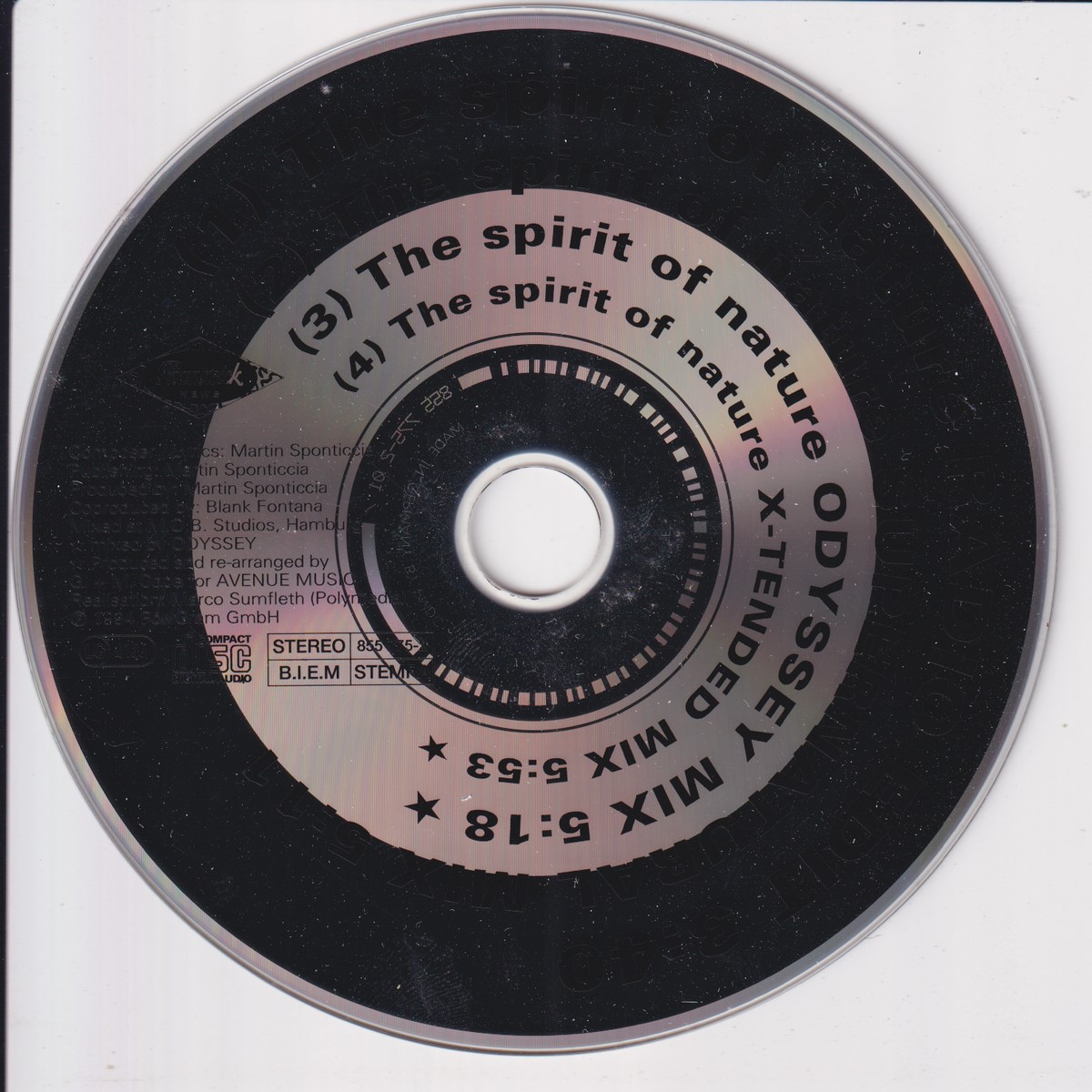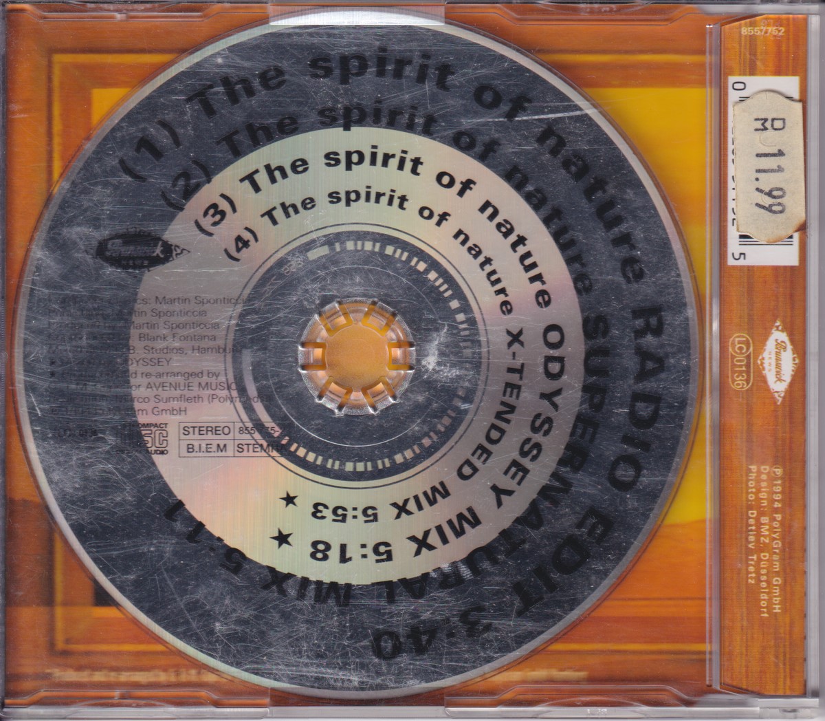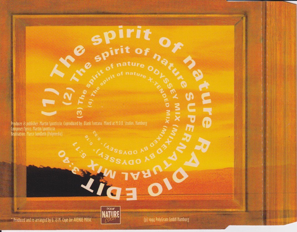 Country of release: Germany Release Year: 1994 Edition: – Features: Import (non‑UK release) Notes: – Tracklist: 1 The Spirit Of Nature (Radio Edit) 3:40 2 The Spirit Of Nature (Supernatural Mix) 5:11 3 The Spirit Of Nature (Odyssey Mix) 5:18 • Remix – Odyssey (4) 4 The Spirit Of Nature (X-Tended Mix) 5:53 • Remix – Odyssey (4) More pictures, click to view full size: