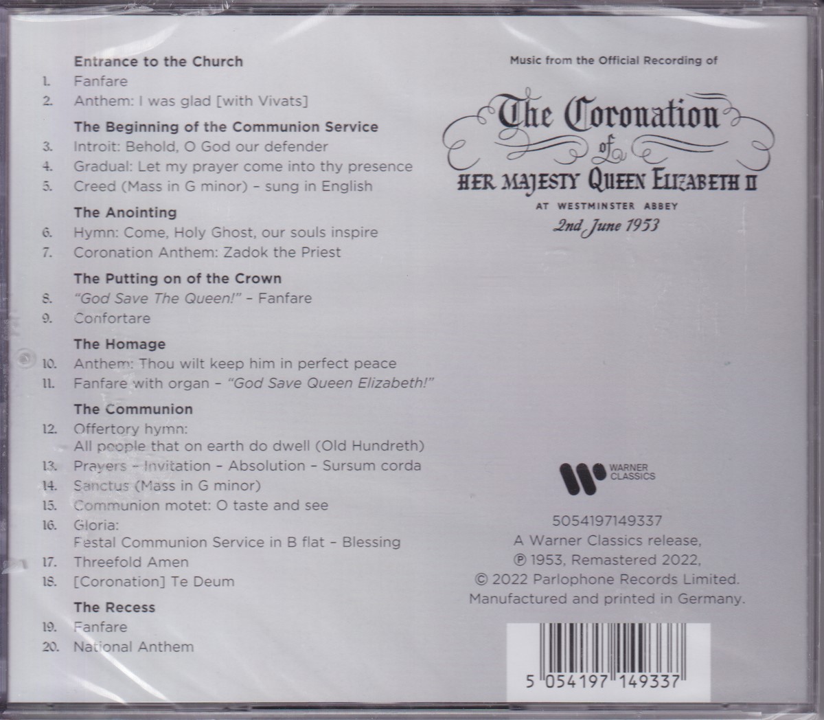 Country of release: Europe Release Year: 2022 Edition: Reissue, Remastered Features: Remastered Notes: – Tracklist: 1 Fanfare 2 Anthem: I Was Glad [with Vivats] 3 Intriot: Behold, O God Our Defender 4 Gradual: Let My Prayer Come Into Thy Presence 5 Creed (mas In G Minor) - Sung In English 6 Hymn: Come, Holy Ghost, Our Souls Inspire 7 Coronation Anthem: Zadock The Priest 8 "God Save The Queen!" - Fanfare 9 Confortare 10 Anthem: Thou Wilt Keep Him In Perfect Peace 11 Fanfare With Organ - "God Save The Queen Elizabeth" 12 Offertory Hymn : All People That On Earth Do Dwell (Old Hundreth) 13 Prayers - Invitation - Absolution - Susum Corda 14 Sanctus (mas In G Minor) 15 Communion Motet: O Taste And See 16 Gloria: Festal Communion Service In B Flat - Blessing 17 Threefold Amen 18 [Coronation] Te Deum 19 Fanfare 20 National Anthem More pictures, click to view full size: