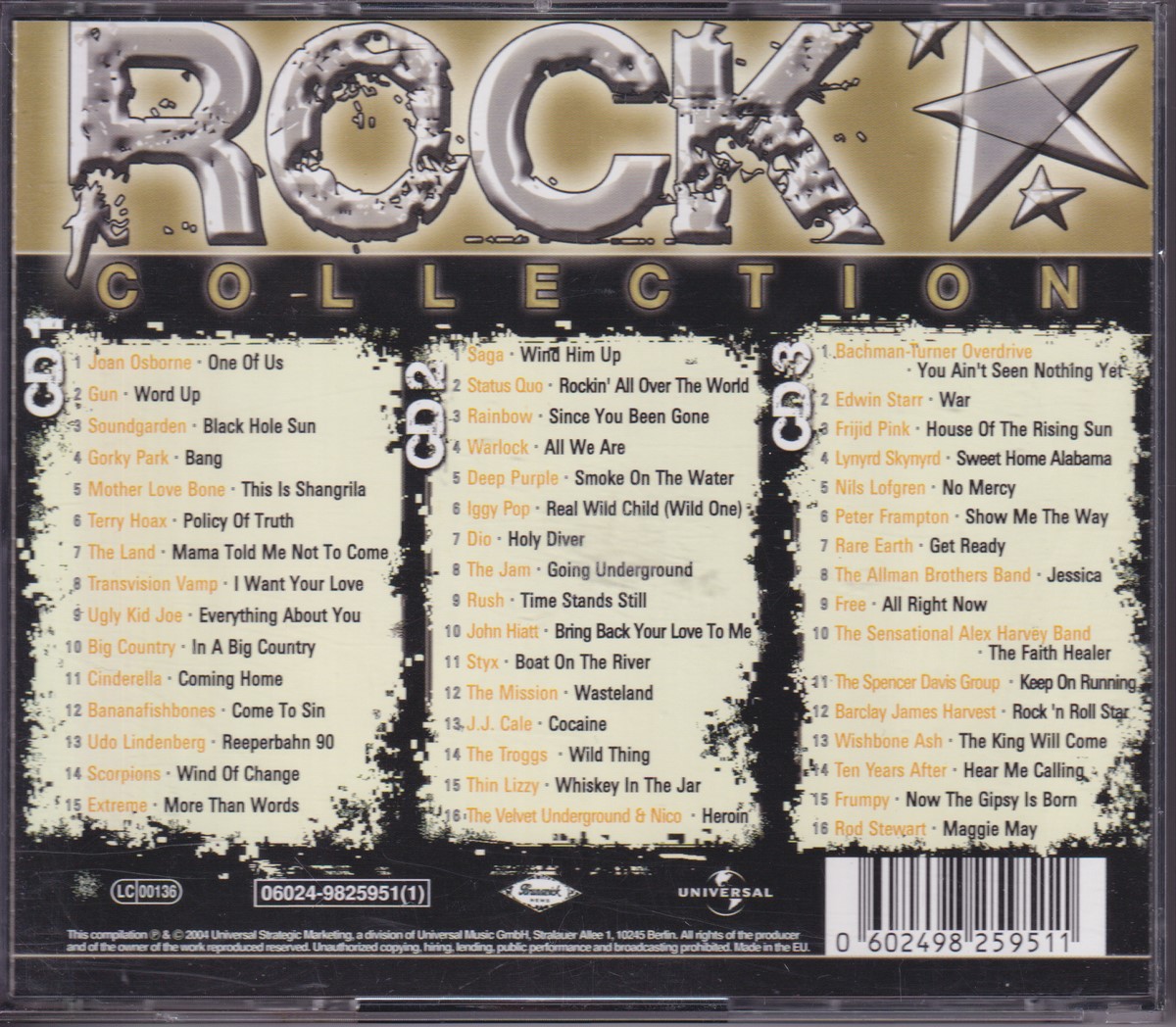 1: Media condition: Poor (P) Sleeve condition: Poor (P) Condition Notes: Not sealed. eBay listing: Rock Collection (2004) LN Condition: Like New Price: £9.95 https://www.ebay.co.uk/itm/113818640996